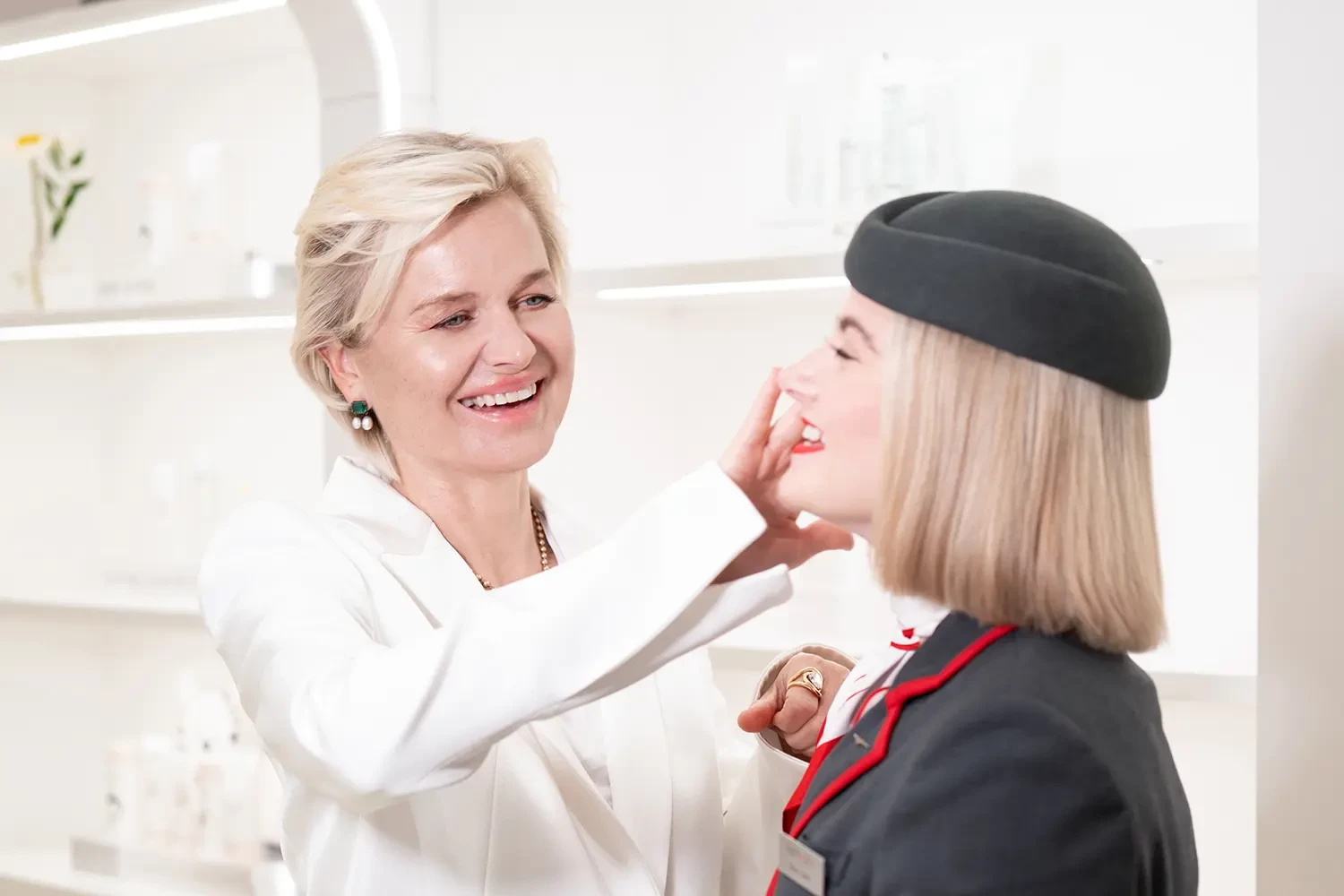Dr Barbara Sturm and a VistaJet Cabin host viewing the product