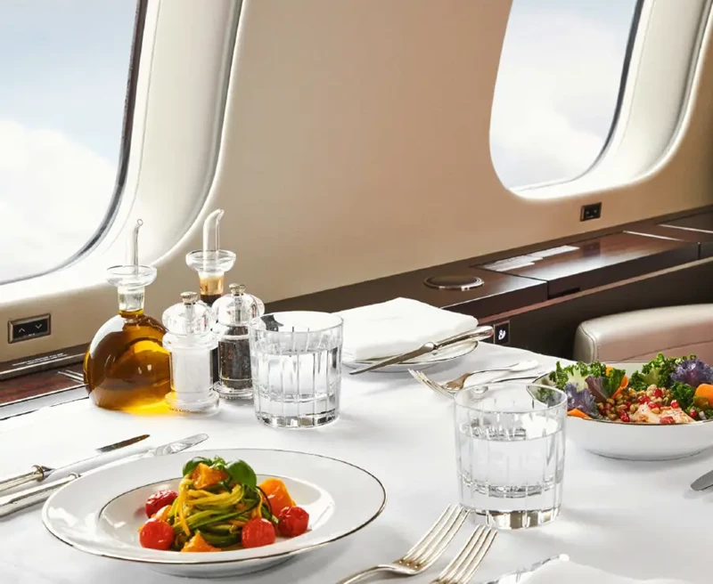 Our Private Dining team manages our onboard catering, providing you with extensive dining options — from exclusive menus curated by world renowned chefs for VistaJet, catering from Michelin star and partner restaurants globally, to a personalized menu prepared by VistaJet’s in-house nutritionist or your favorite dish.