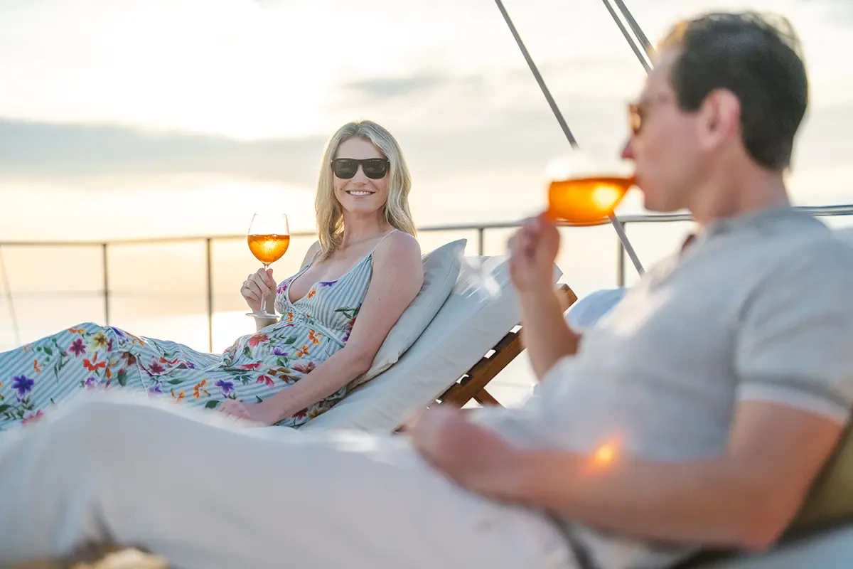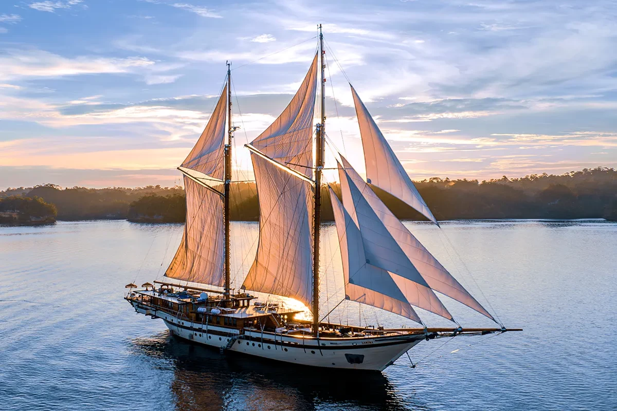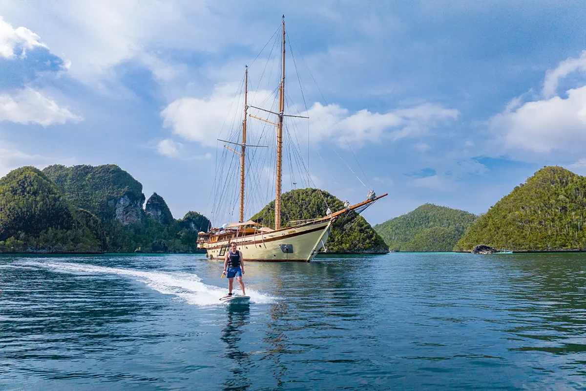 Launched in 2014, the 65m/ 214ft Lamima is your floating base camp for this adventure, the epitome of luxury from topsail to keel. Constructed using traditional methods by local boatbuilders on the Indonesian island of Sulawesi, she is a classic Phinisi yacht and features craftsmanship by Pak Haji Baso and exterior design from Spanish designer Marcelo Penna. Custom built with the specific intent of providing the ultimate in comfort, elegance, and safety while maintaining the warm ambiance of traditional Indonesian hospitality, she offers a massive 400 sqm of the open deck and is the ultimate yacht for sailing in Indonesia.