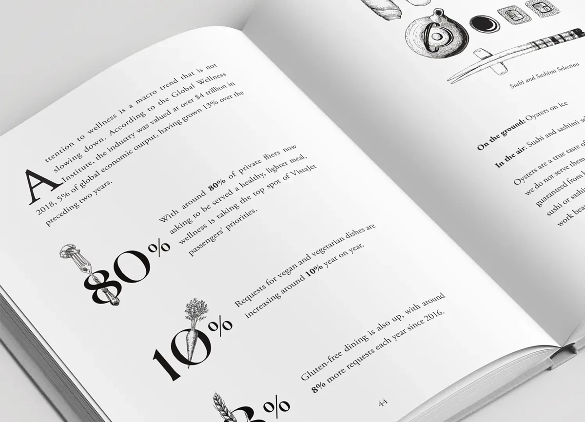 The Little Book of Dining in the Sky explores the art and science behind eating well with VistaJet. Tasting notes, jet chef secrets, travel wellness, the jet kitchen and service suggestions whoever you are dining with. The musings and expert advice are all aimed at helping you discover the pleasures of the table, especially at altitude.