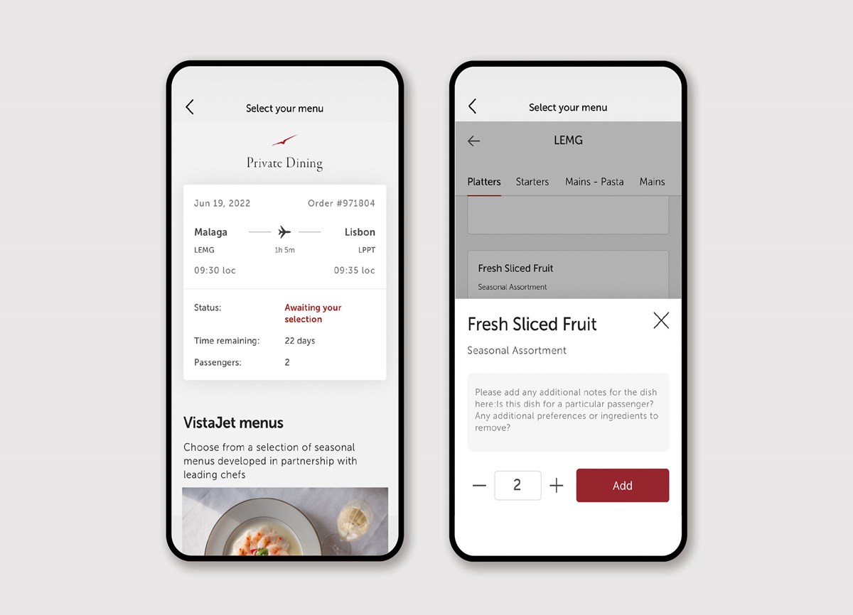 Use our Private Dining app to book your in-flight meals with ease. Choose from the curated VistaJet seasonal menu, order dishes from world-renowned restaurants, or request a preferred dish.